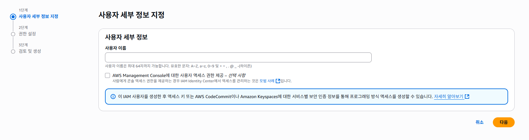 첫 번째는 AmazonS3FullAccess 정책을 선택하는 방법입니다, 저는 개인적으로 이 방법을 선호하지 않고 있는데 AmazonS3FullAccess는 사용자가 S3의 모든 버킷에 접근을 가능하다는 의미이기에 보안 이슈가 생길 우려가 있습니다.