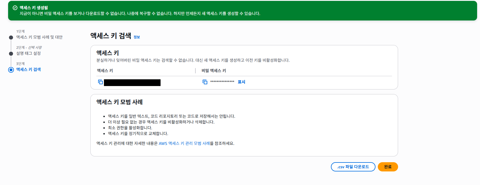 선택적으로 태그를 입력하고 다음단계로 넘어가면 이렇게 액세스 키를 생성되는 것을 확인할 수 있습니다.
