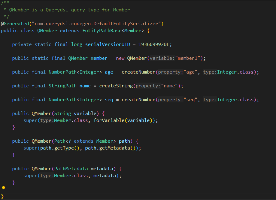 상단의 이미지는 entity 클래스를 빌드 했을 때 생성되는 QClass이다. QClass는 타입 세이프(Typed-Safe) 쿼리를 생성하기 위해 자동으로 생성되는 클래스이다.