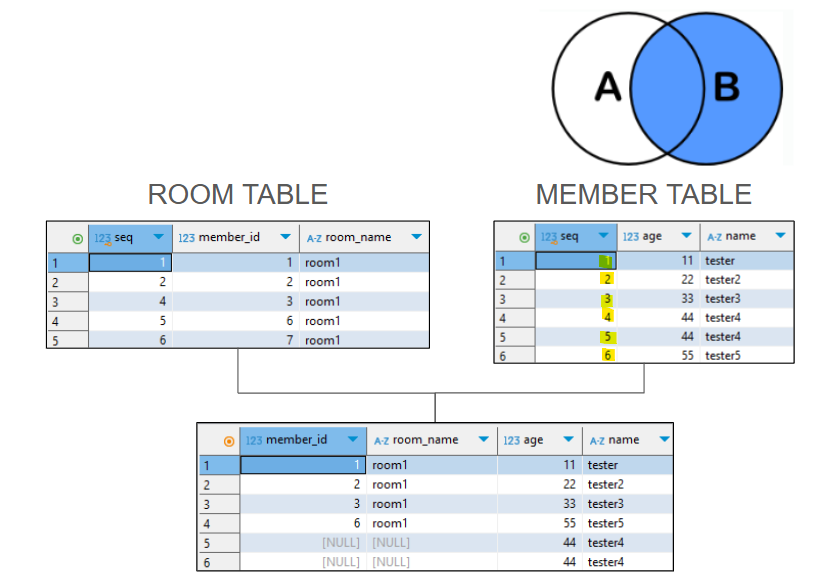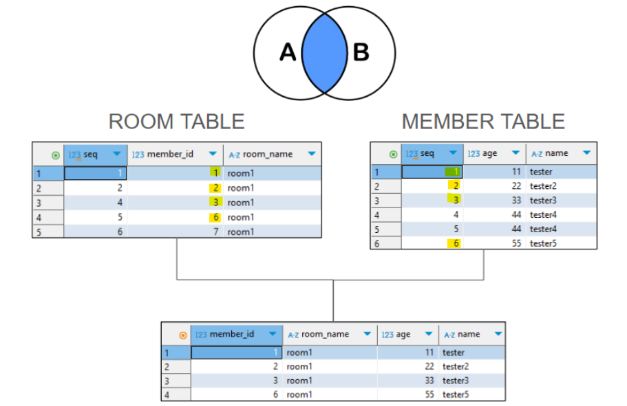 JOIN에는 여러가지 종류가 있는데 INNER, LEFT, RIGHT, FULL을 설명할 것이다, 예시에 사용할 테이블은 이렇게 사용할 것이다.
