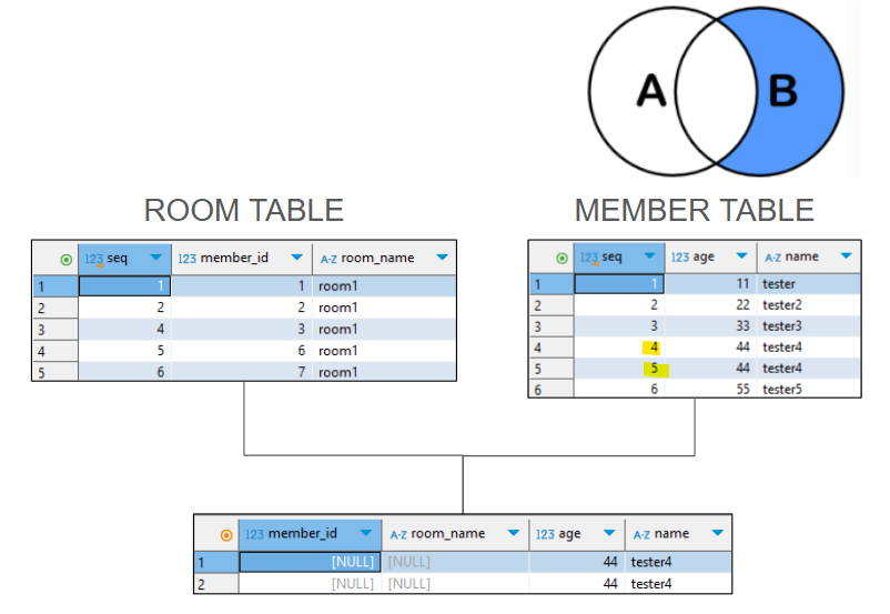 RIGHT JOIN은 쿼리문을 기준으로 RIGHT 오른쪽에 있는 테이블을 중심으로 출력을 하는데 오른쪽 테이블 전체와 on 조건에 해당하는 값중에서 왼쪽에 있는 테이블에 포함하는 값은 제외한다.