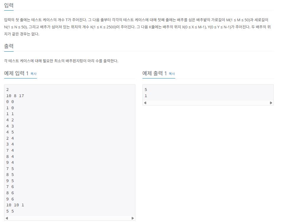 1. 가로 세로에 대한 변수를 M,N으로 설정하는게 익숙하지 않아 문제를 많이 풀어봐야겠다.