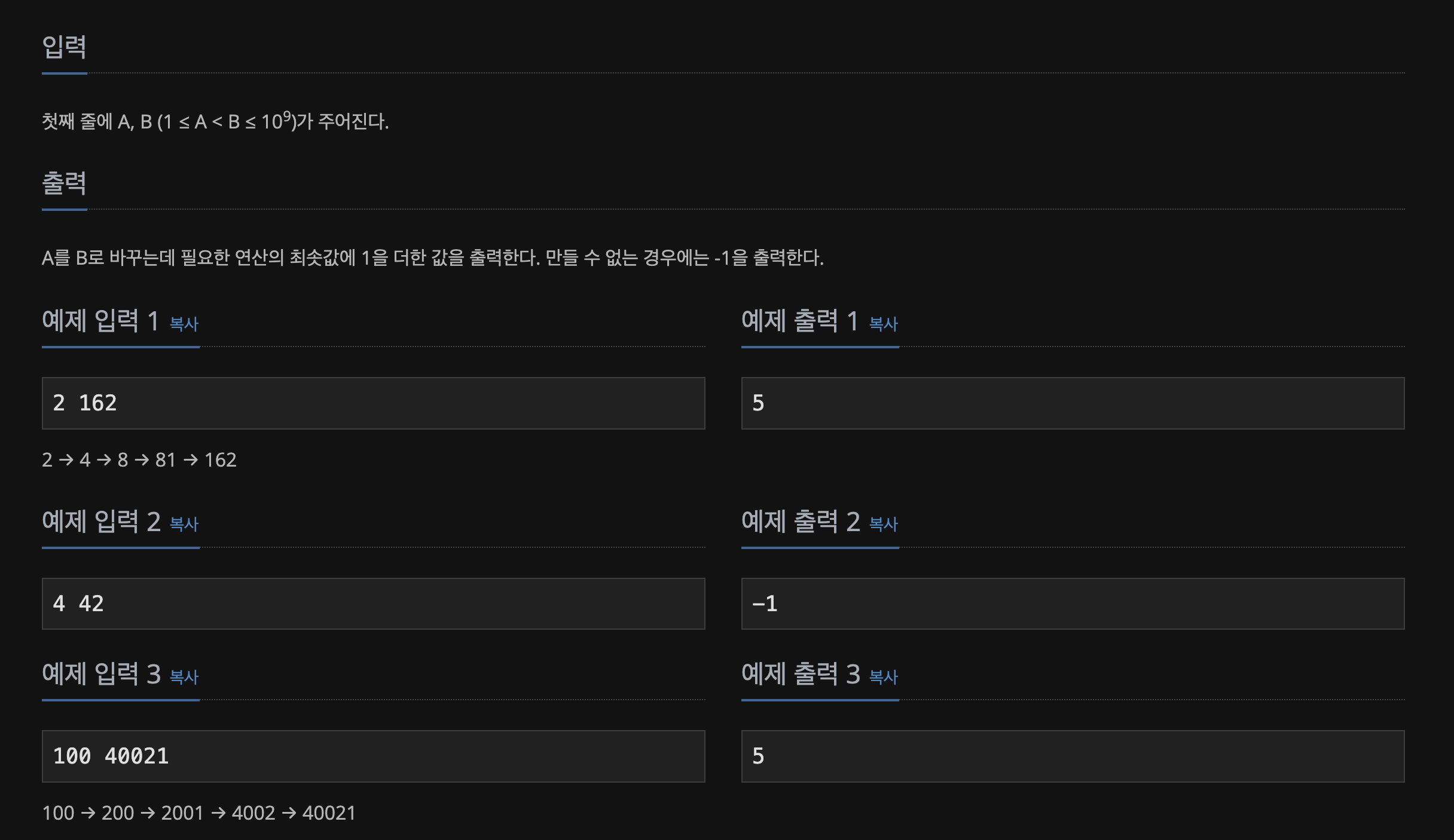 A가 2이고 B가 162면 162를 2로 만드는 연산을 시작한다.