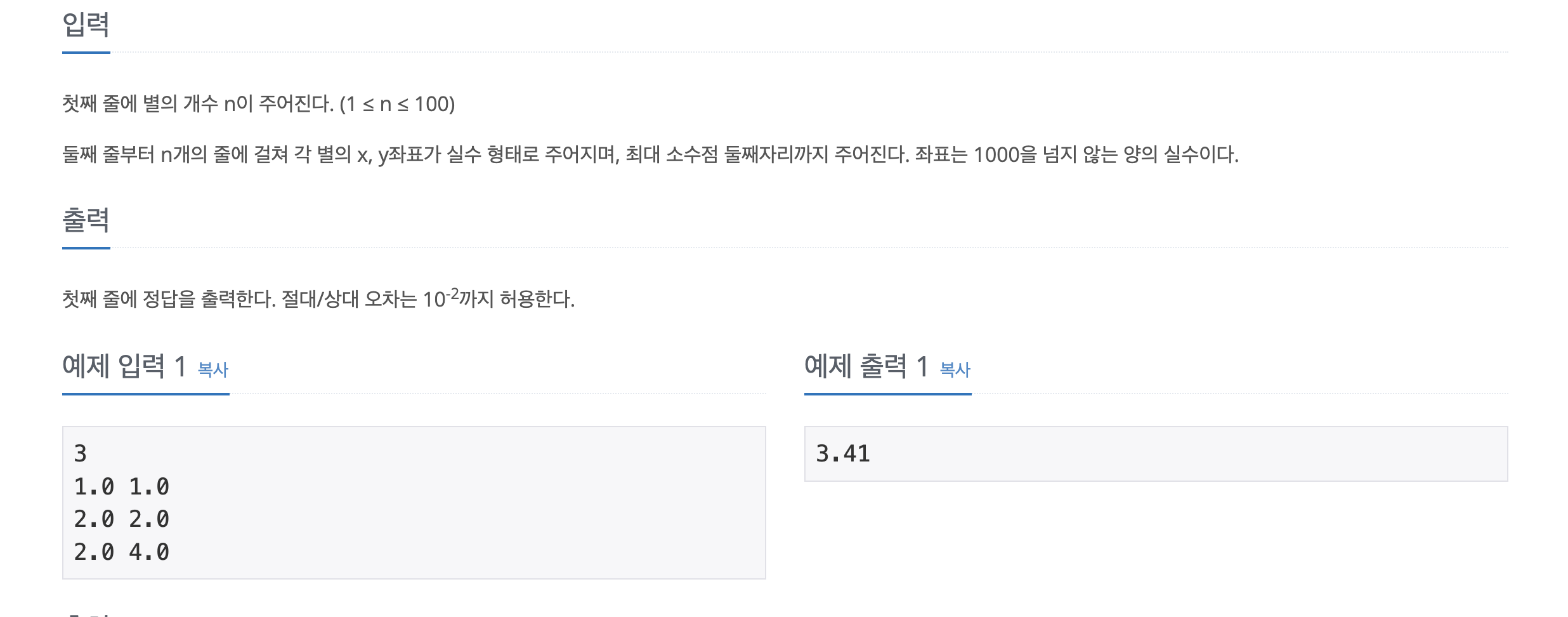 모든 별이 이어져있다고 하니까 MST 알고리즘을 사용하여 최소 거리 합을 구해주면 된다. 문제는 모든 간선 가중치에 대한 계산을 포함한 간선 정보를 계산하고 모두 우선순위 큐에 넣어야한다는 점이 좀 번거로울 뿐이다.