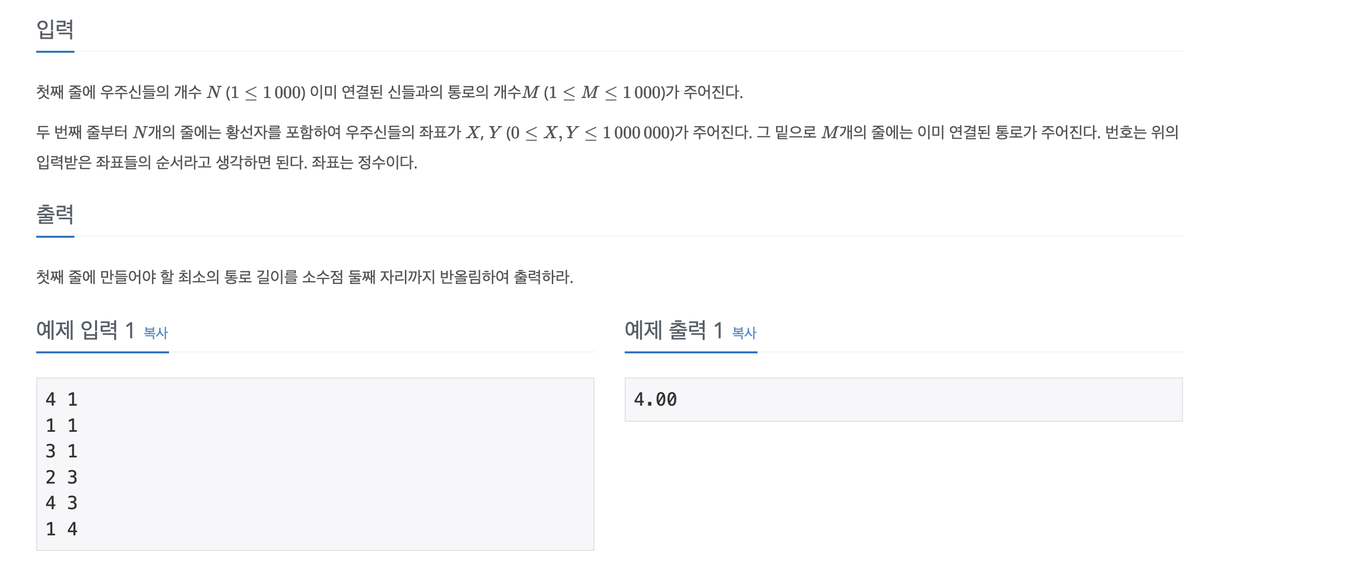우주신을 노드로 생각한다면, 결국 이 문제는 이미 연결되어있는 간선들을 제외하고 연결할 수 있는 최소 신장 트리(MST)를 만들어 더해진 간선들의 가중치 합을 구하는 문제이다.