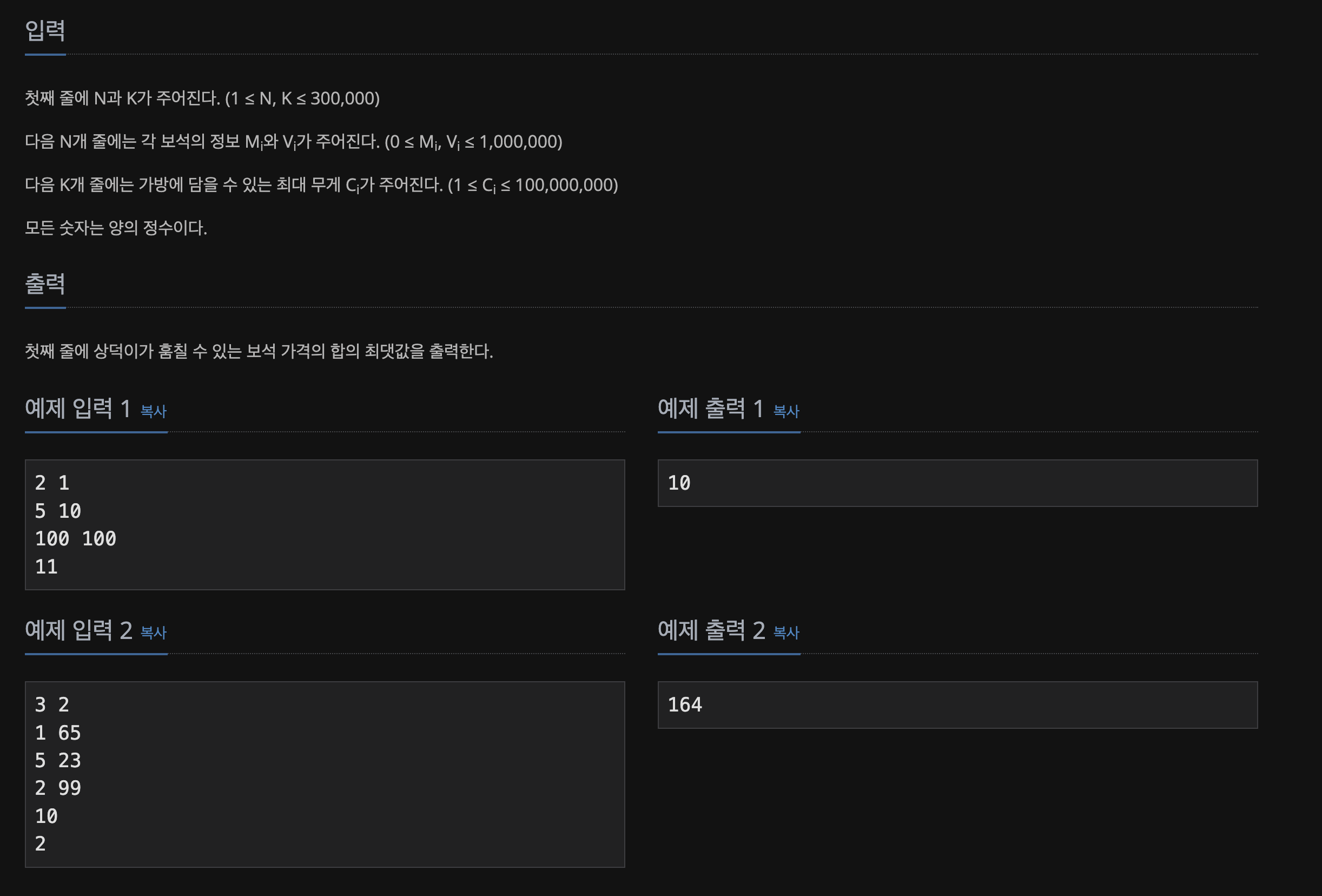 1) 가방에 물건들을 효율적으로 "어떻게" 넣어야 보석 가격 합의 최댓값을 구할 수 있을까? 만약 내가 보석을 훔친다면, 가벼운 무게부터 훔칠 것이다. 왜냐하면 가벼운 무게는 나중에 널찍한 가방(담을 수 있는 공간이 큰)에도 담을 수 있기 때문이다. 하지만 반대로 무거운 물건은 나중에 담으면 담기 어려워지는 상황이 생길 것이다.