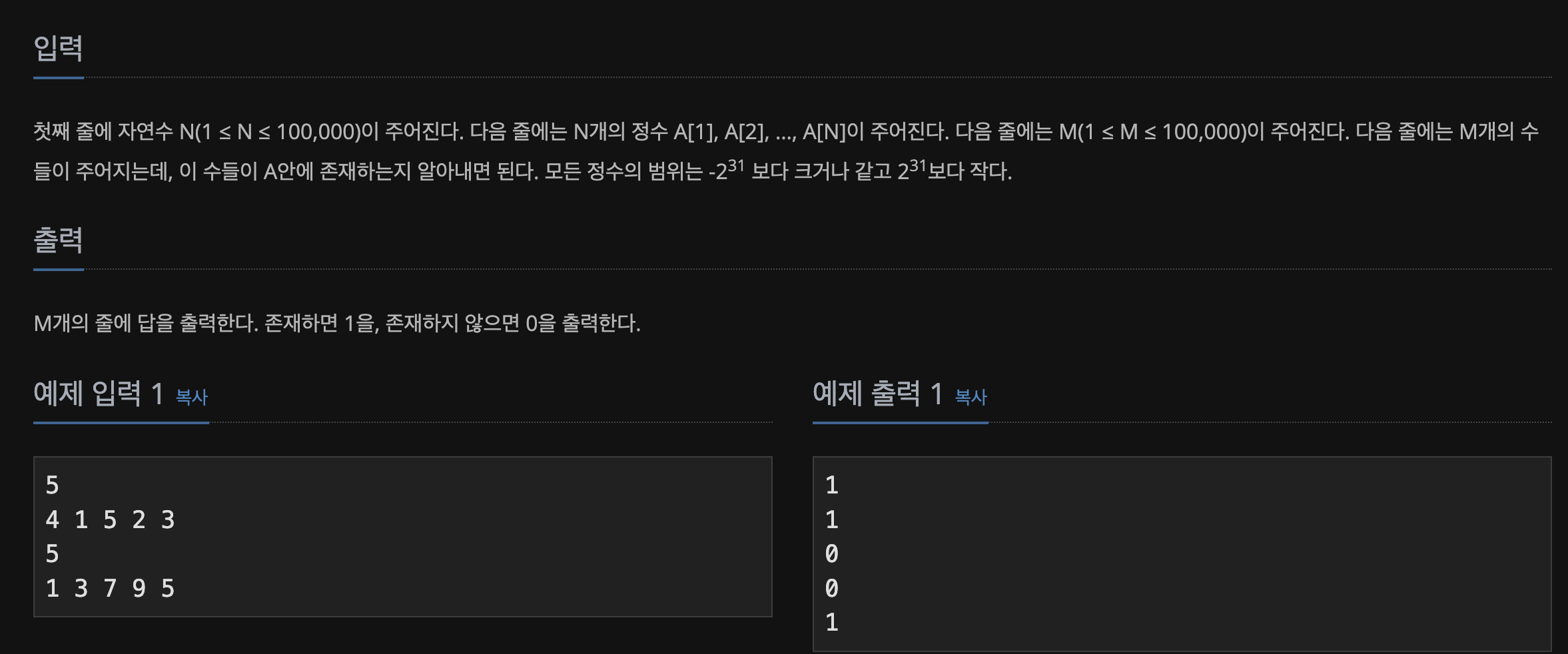 이분탐색 라이브러리 함수를 사용하여 찾고 존재하면 입출력을 진행한다.