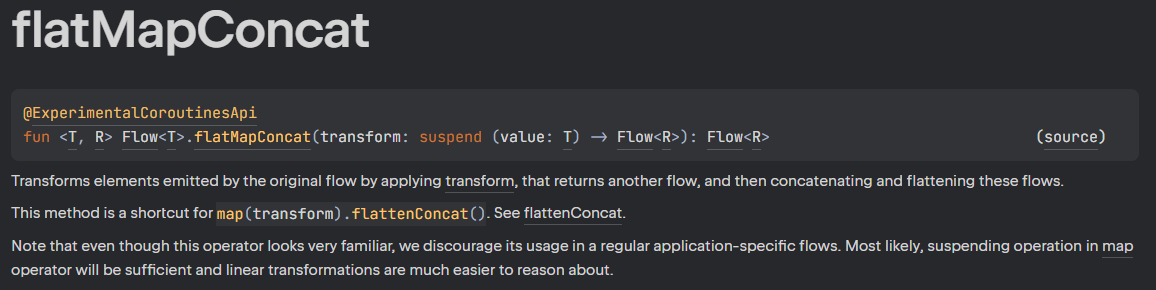 map(transform).flattenConcat()의 단축 형태입니다.flattenConcat을 참조하십시오.비록 이 연산자가 매우 친숙해 보일지라도, 정규 애플리케이션 특화 Flow에서 사용하는 것을 권장하지 않습니다. 대부분의 경우, map 연산자에서 서스펜딩 작업을 수행하는 것이 충분하며, 선형 변환이 훨씬 이해하기 쉽습니다.