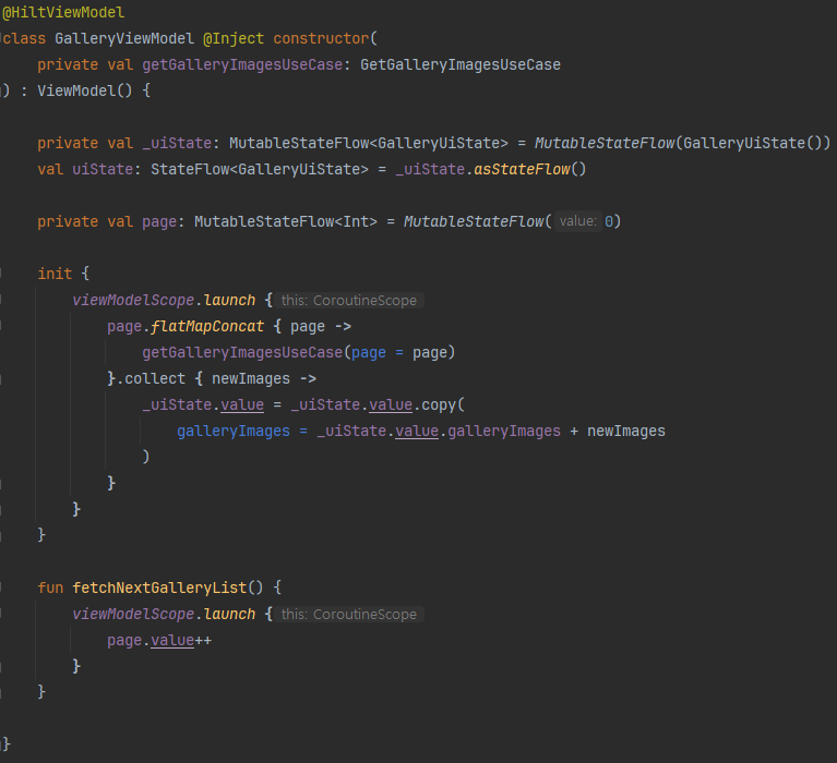 page가 업데이트 됨에 따라 init 내부에 선언된 ViewModelScope 블럭안에서 getGalleryImagesUseCase()의 반환값을 수집하여 uiState를 업데이트 해주고 있다.