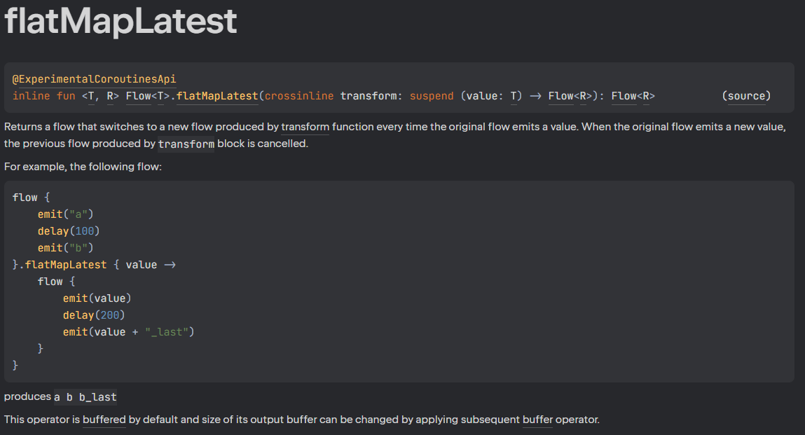 기존의 Flow가 새 값을 방출하면transform블록에 의해 생성된 이전 Flow는 취소됩니다.이 연산자는 기본적으로 버퍼링되며, 출력 버퍼는 후속 버퍼 연산자를 적용하여 변경할 수 있습니다.