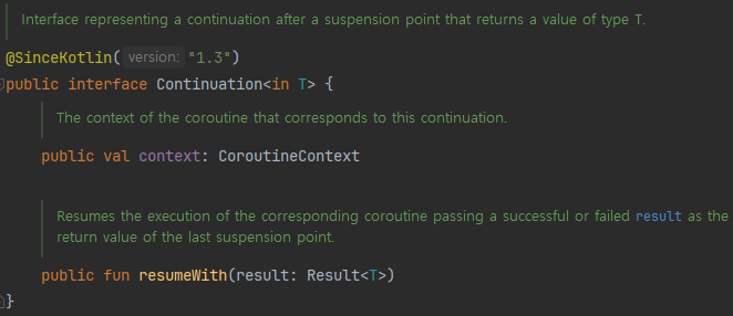 사진을 보면 Continuation 인터페이스는 CoroutineContext와 resumeWith() 함수를 각각 가지고 있습니다.