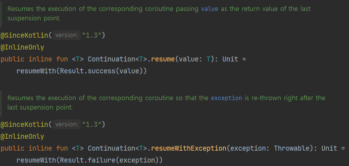때문에 코루틴에서는 이를 항상 Result로 감싸주는것이 귀찮(?)았던 것인지 확장함수의 형태인 Continuation.resume()을 지원하고 있습니다.