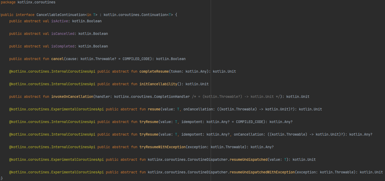 CancellableContinuation에서 정의된 내용들이 많지만 그에대한 내용은 다른 포스팅에서 따로 정리하여 보도록 하겠습니다.
