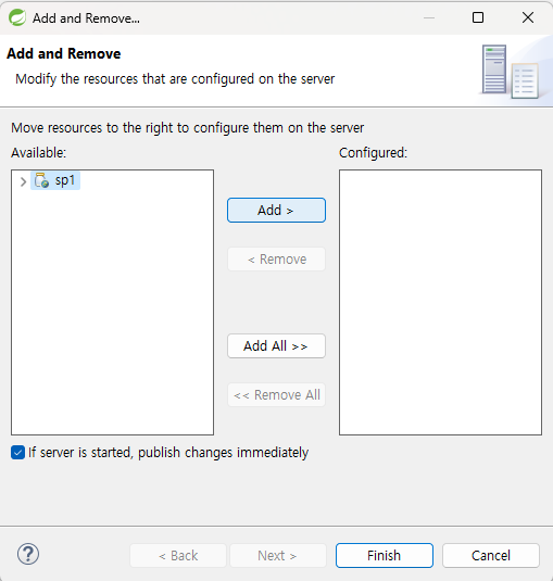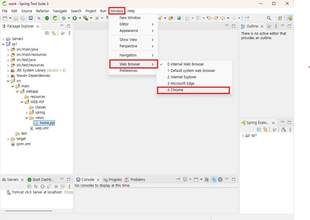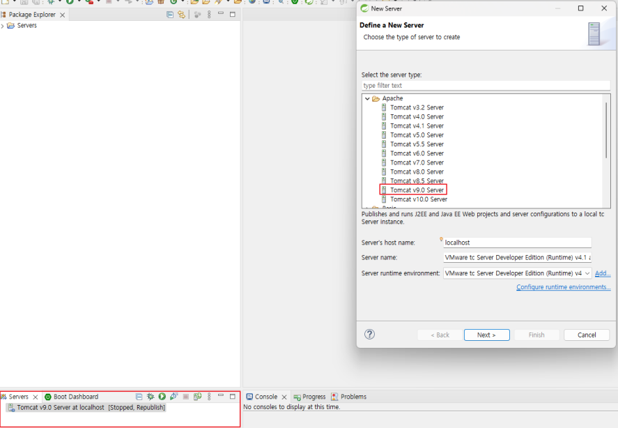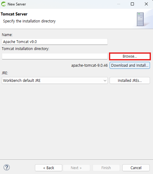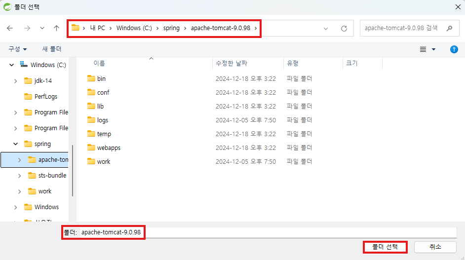 Browse 선택 후 C:\spring\apache-tomcat-9.0.98 경로로 설정