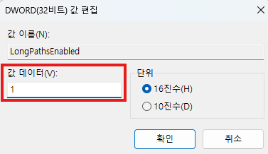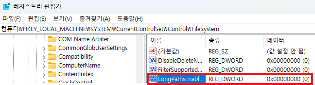 LongPathsEnabled 값을 찾아 더블클릭하고 값을 0에서 1로 변경