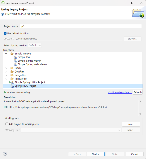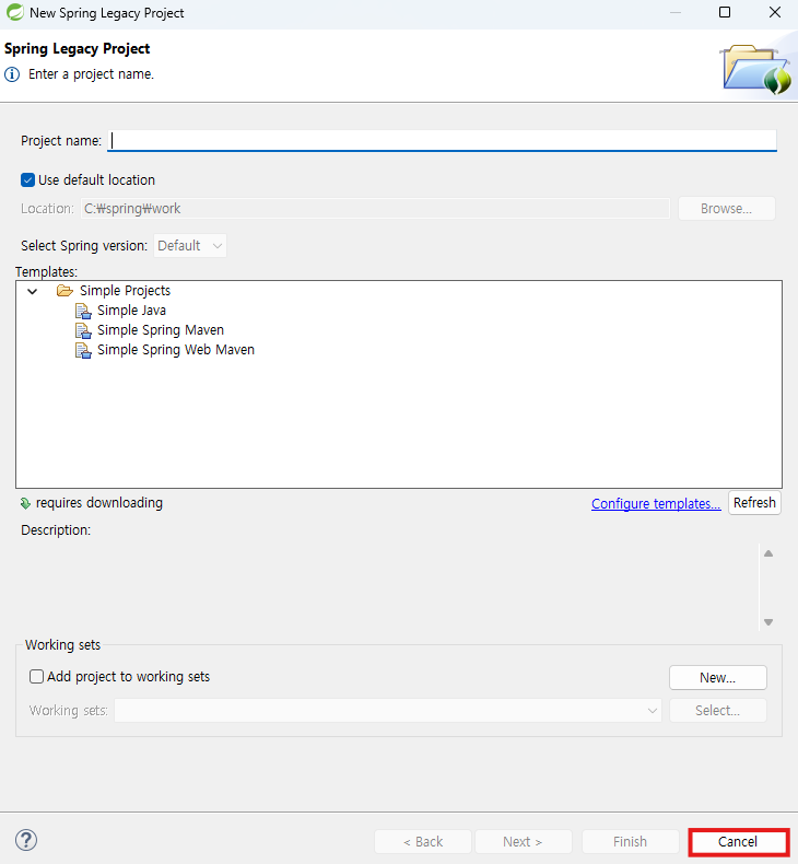 Spring Legacy Project를 클릭한 후 Cancel 누르기