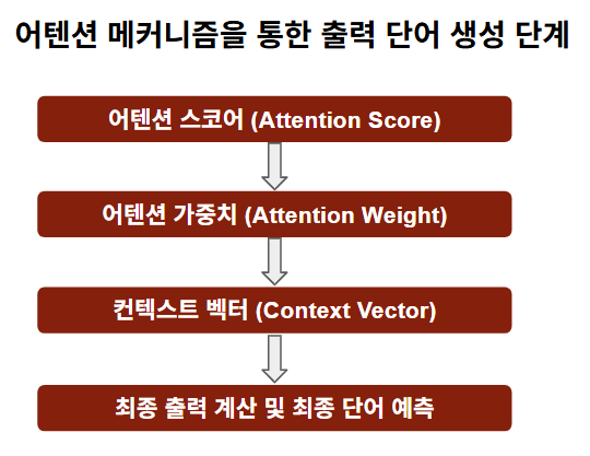 이러한 구조를 통해 어텐션 메커니즘은 디코더가 출력 단어를 생성할 때마다 입력 문장의 모든 부분을 참조할 수 있게 하며, 각 시점에서 가장 연관성이 높은 부분에 집중할 수 있도록 한다.