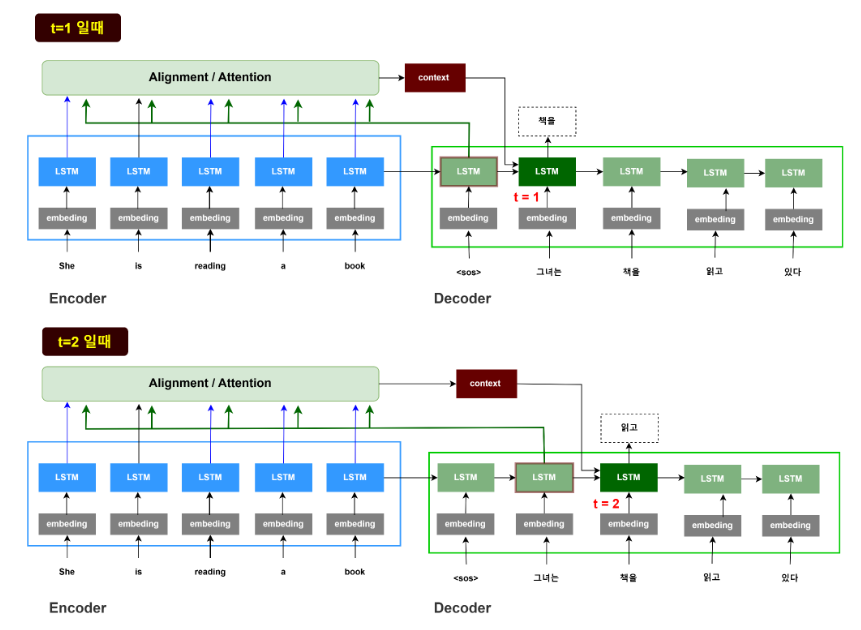 위 그림에서 볼 수 있듯이, 디코더는 각기 다른 시점에서 서로 다른 컨텍스트 벡터를 생성한다.