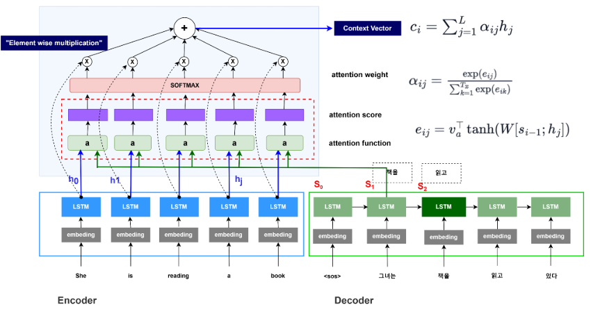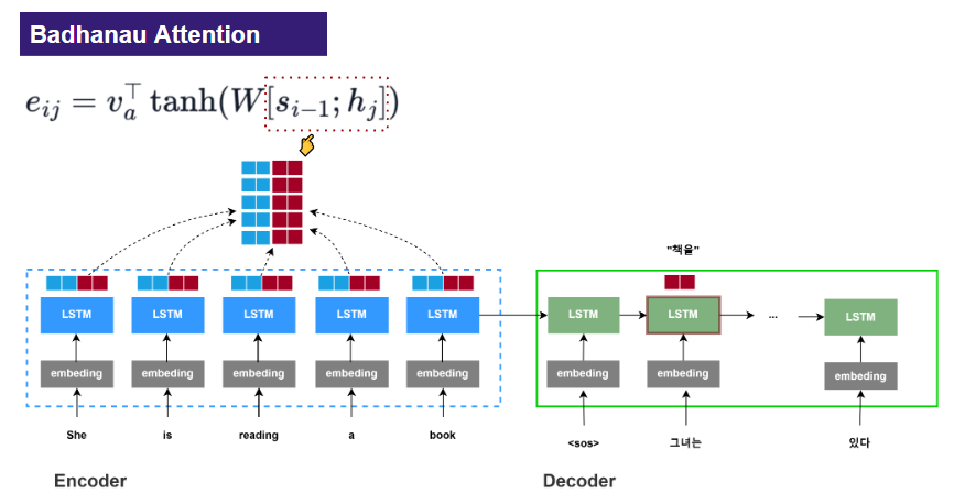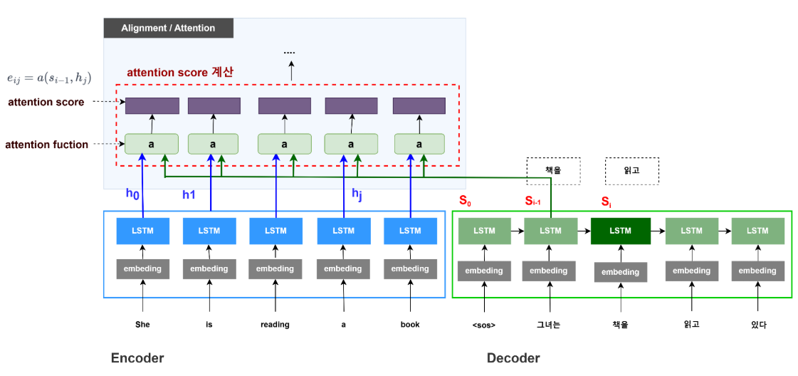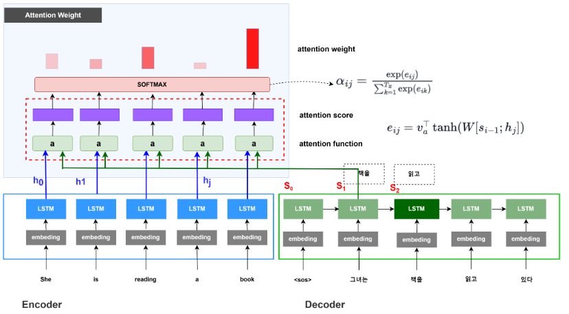 위 그림에서 각각 인코더 은닉 상태, 디코더의 이전 은닉상태가 어텐션 함수에 입력이 되고 어텐션 스코어로 출력이 된다. 산식은 아래와 같다.