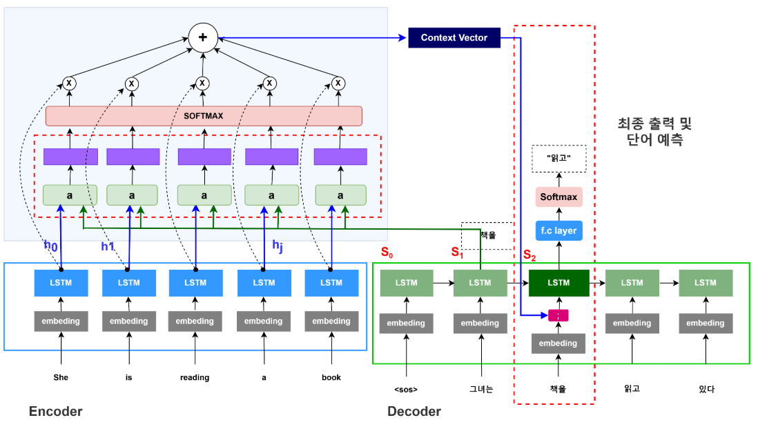 그리고 파란색 블록으로 표시된 인코더의 각 은닉상태와 concat 연산을 통해 결합됩니다. 번역가가 한 단어를 번역하기 위해 원문의 모든 단어를 동시에 참조하는 과정을 모방한 것이다.