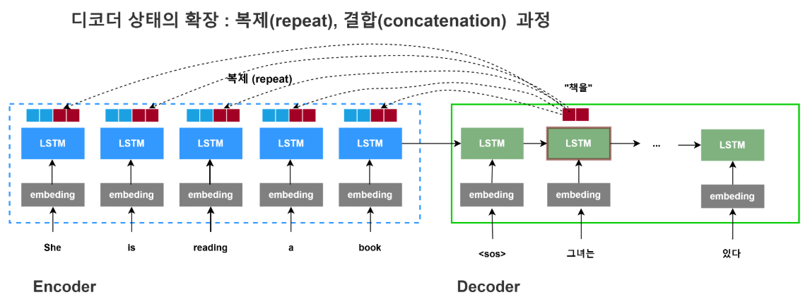 빨간색 블록으로 표시된 디코더의 현재상태는 repeat 연산을 통해 인코더의 각 단어에 대응되도록 복제됩니다.