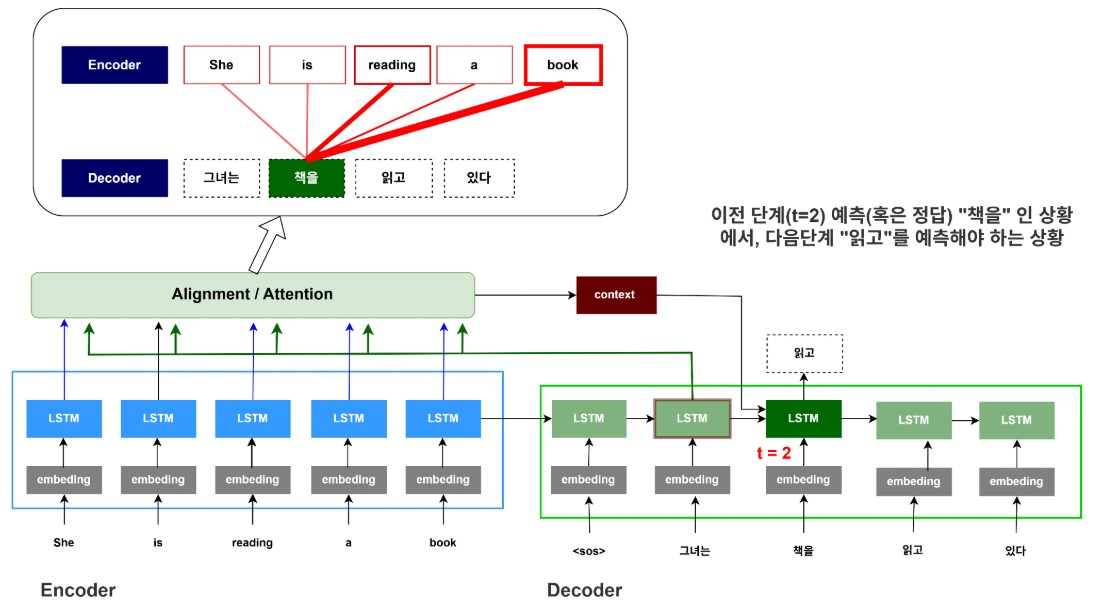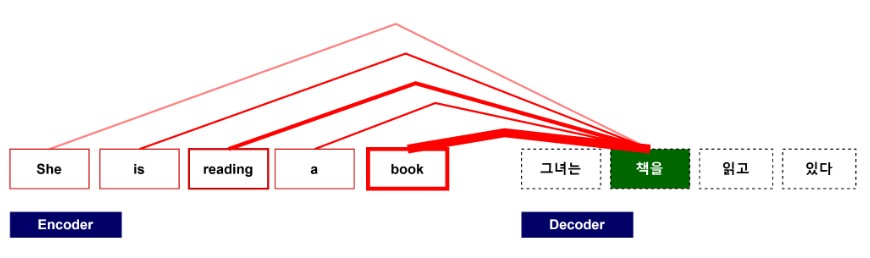 디코더는 출력 단얼르 생성할 때마다 인코더의 모든 은닉 상태를 참조하여, 핸재 생성하려는 단어와 가장 연관이 높은 입력 정보를 선별적으로 활용합니다. 아래 이미지 처럼, 디코더는 특정 시점에서 '책을'이라는 단어를 예측할 때, 'book'이라는 단어에 가장 높은 주의를 기울이고 있습니다. 이러한 과정은 어텐션 메커니즘을 통해 이뤄지며, 인코더의 은닉 상태들을 기반으로 가중치가 동적으로 계산되어 컨텍스트 벡터로 결합됩니다.