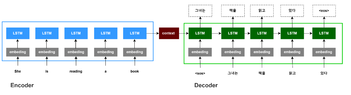 위 이미지를 보면 모델에서 인코더의 마지막 은닉 상태 하나만이 고정된 크기의 컨텍스트 벡터로 사용되어 번역의 역할을 담당하는 디코더에 전달 됩니다.