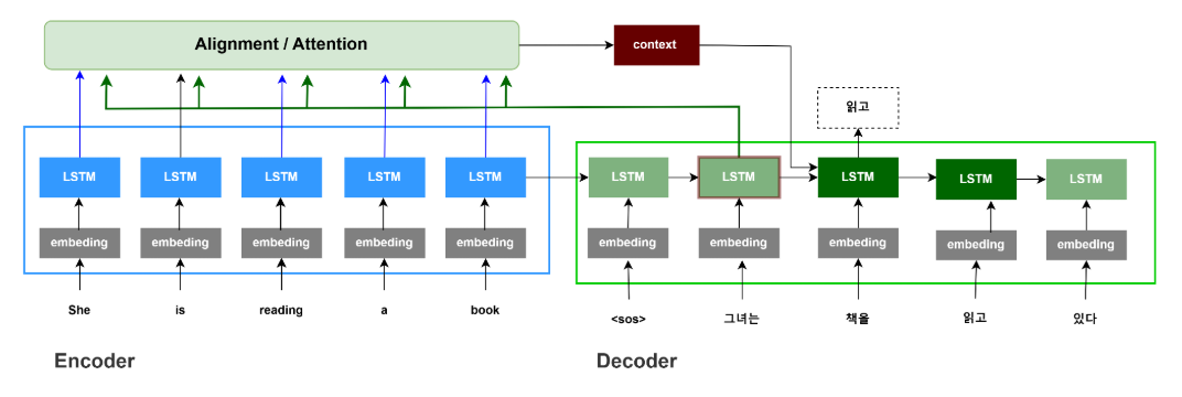 디코더는 매 시점 세 가지 정보를 활용하여 다음 단어를 예측한다.