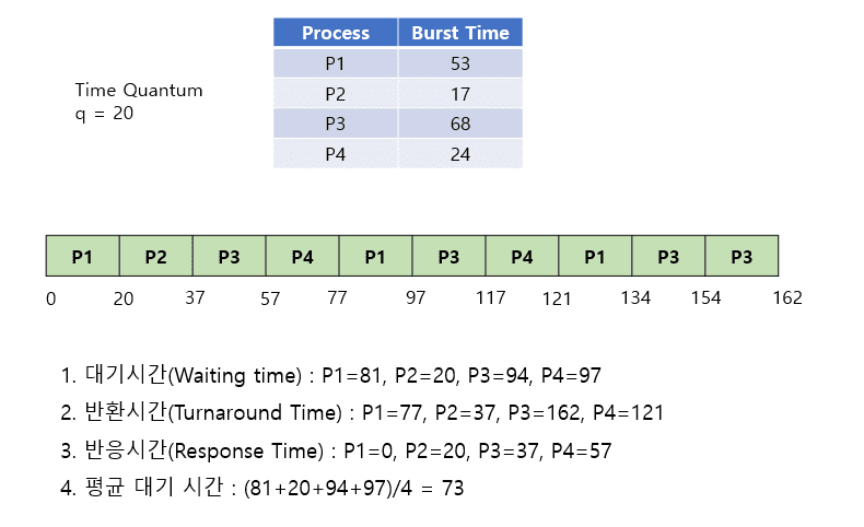 현대 컴퓨터가 쓰는 스케줄링인 우선순위 스케줄링의 일종으로 각 프로세스는 동일한 할당 시간을 부여해서 해당 시간동안안 CPU를 이용합니다. 그 시간 안에 끝나지 않으면 강제 중단 후 다시 준비 큐(ready queue)의 뒤로 가는 알고리즘입니다.