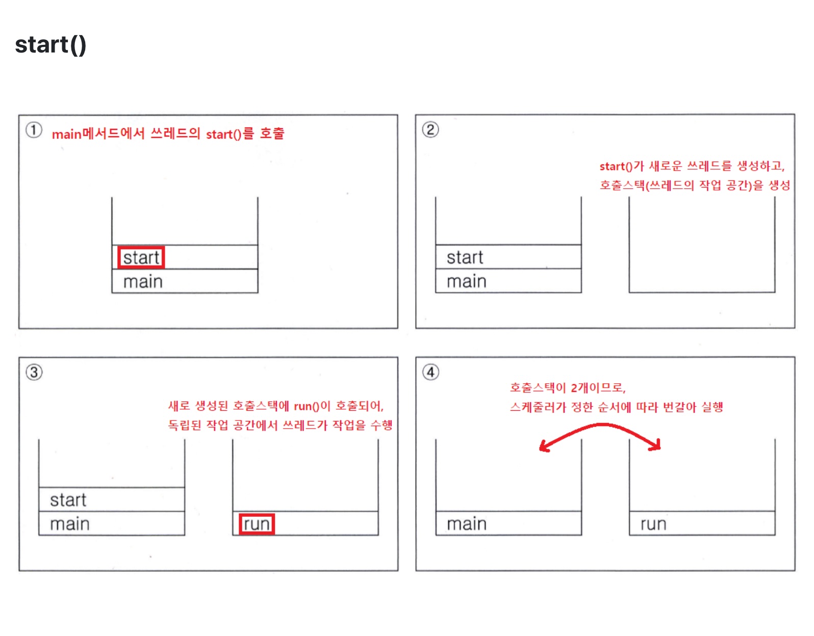 스레드를 시작하기 위해서는 start() 메소드를 호출해야 합니다. start() 메소드는 새로운 스레드를 생성하고, 해당 스레드에서 run() 메소드를 실행합니다. 직접 run() 메소드를 호출하는 것이 아니라 start() 메소드를 호출해야한 Java Virtual Machine 이 스레드를 적절히 처리하고 동작시킬 수 있습니다.