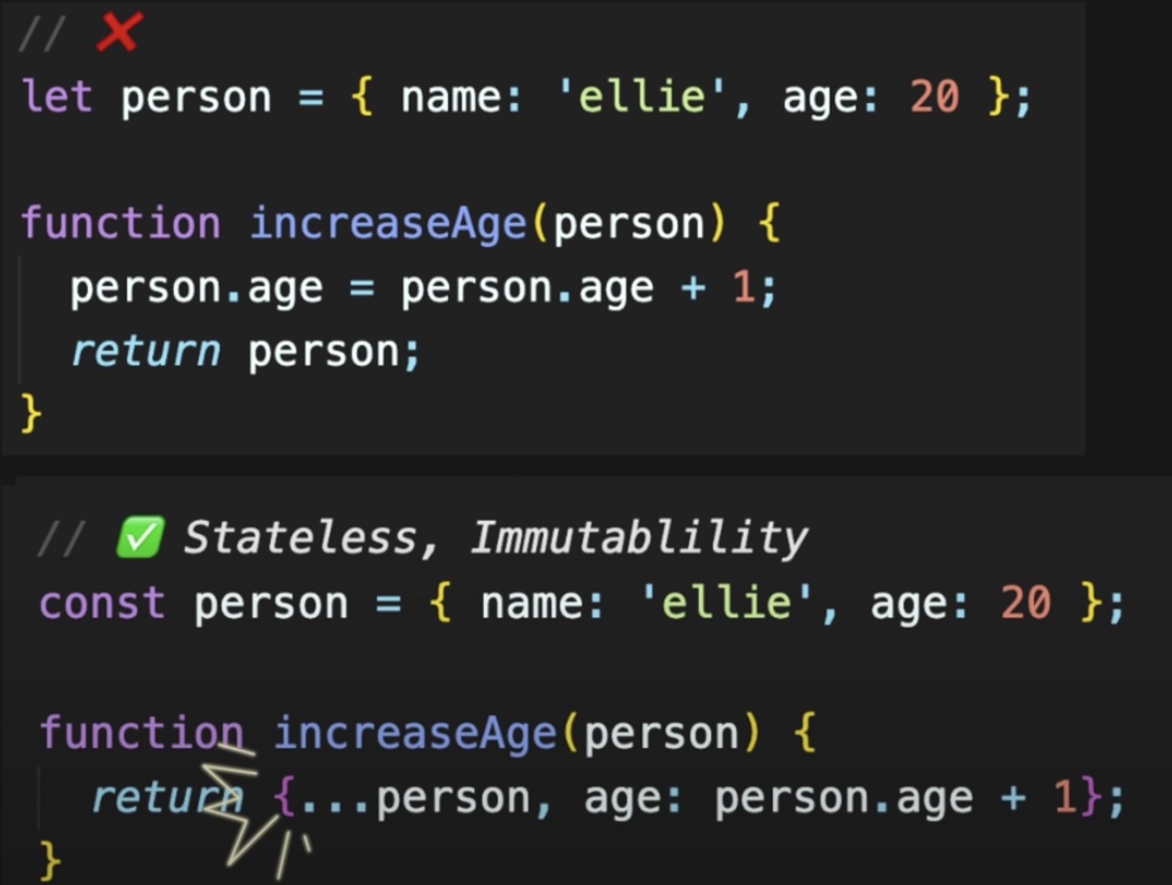 UI 애플리케이션 특성 상 많은 상태 변화가 일어나기 때문에 순수 함수형 프로그래밍만으로는 무리가 있습니다.