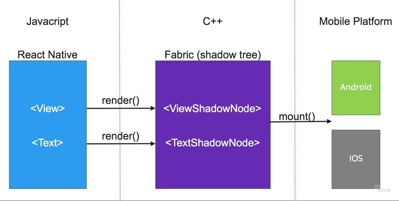 - React에서 생성된 React Element Tree를 기반으로 Shadow Tree라는 구조를 만들어 네이티브 화면에 최적화된 방식으로 렌더링한다.