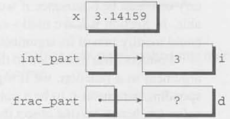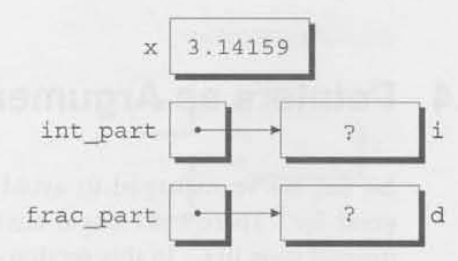i와 d의 앞에 &연산자가 있기 때문에, decompose에 대한 argument는 i와 d에 대한 포인터이고, i와 d의 값이 아니다. decompose가 호출되었을 때, 3.14159의 값은 x에 복사될 것이고, i에 대한 포인터는 int_part에 저장되고, d에 대한 포인터는 frac_part에 복사된다.