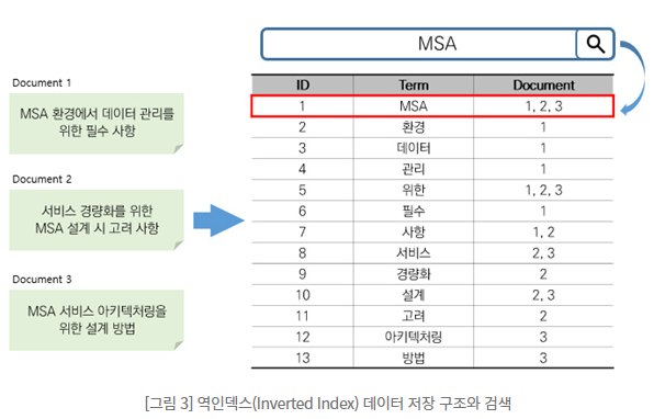 'MSA'라는 단어가 저장된 도큐멘트를 알고 있기 때문에 그 수와 상관없이 한번의 조회로 검색을 끝낼 수 있다.