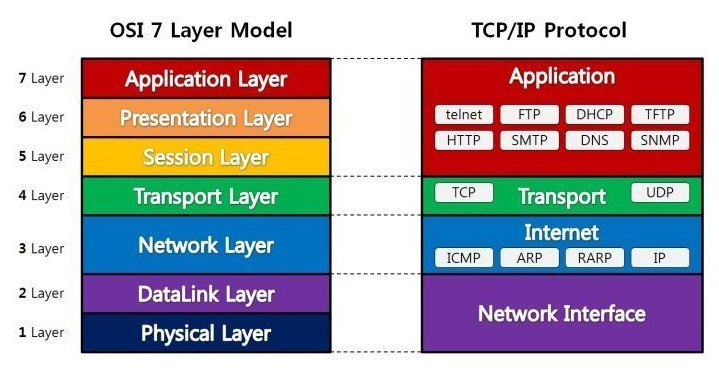 위는 OSI 7Layer를 TCP/IP Protocol의 4계층을 각각의 역할게 맞게 구분한 사진이다.