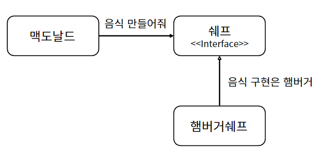 맥도날드가 쉐프를 의존하고, 햄버거 쉐프도 쉐프라는 인터페이스를 의존하게 된다..