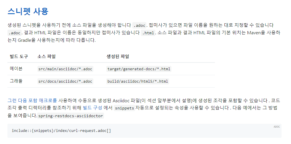 해당 파일들을 src/docs 하위에 있는 asciidoc 파일에 include 시켜준다.