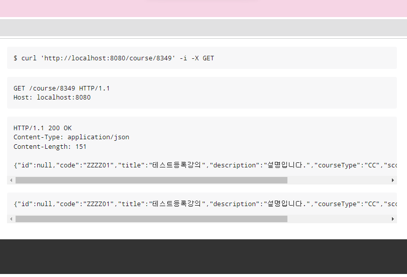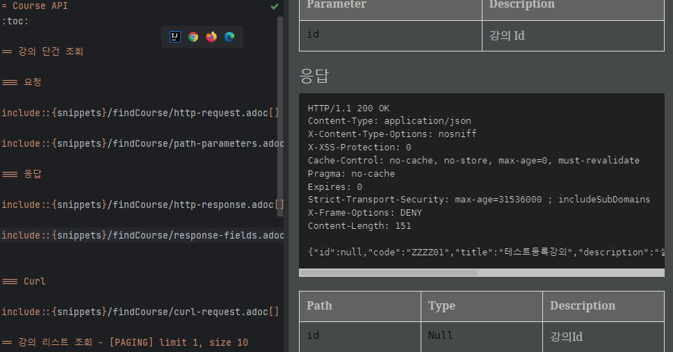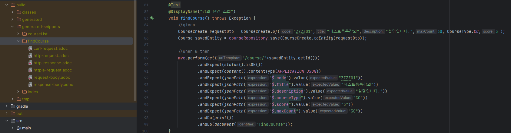 테스트코드의 마지막에 document("findCourse") 라는 코드로 인해