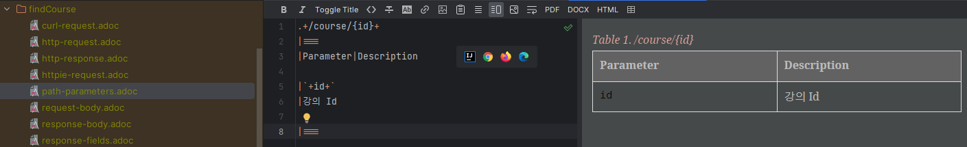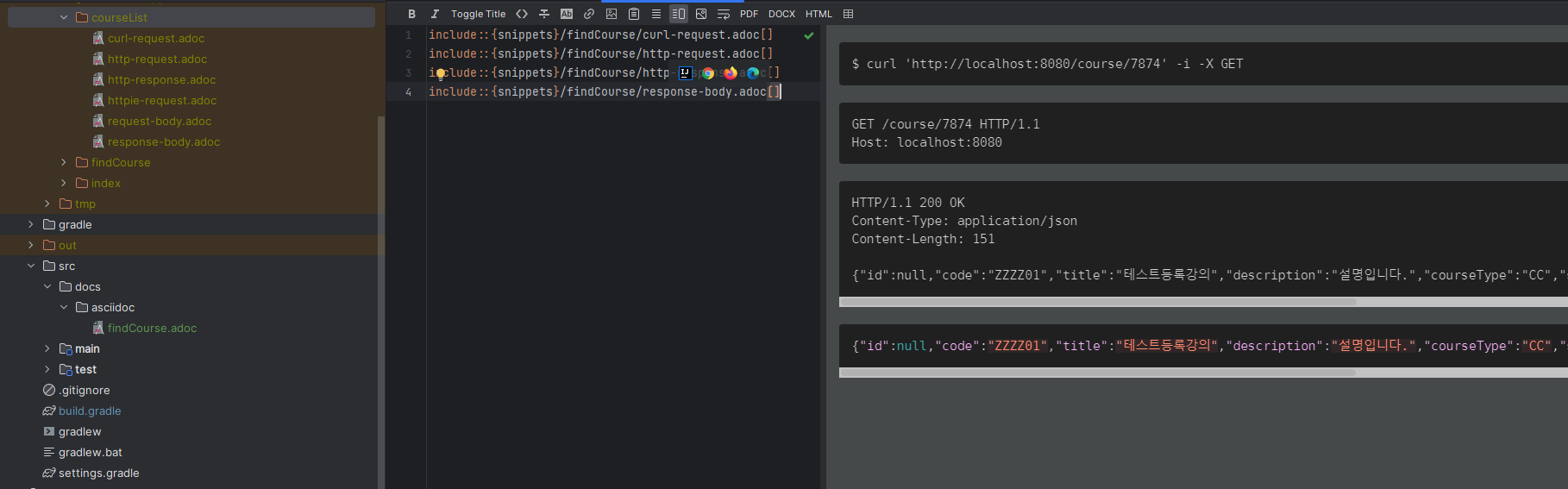 findCourse라는 패키지가 생성되었고, adoc 파일이 생성되었음이 확인된다.