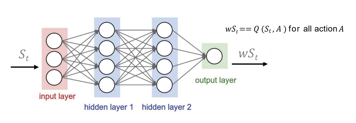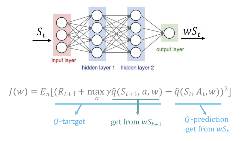 타깃 네트워크 업데이트 : 타깃 네트워크의 파라미터 는 주기적으로 예측 네트워크 파라미터 w로 업데이트됨. 이는 학습이 어느정도 진행된 후에 목표값을 변경하여 더 안정적으로 학습을 진행하도록 함