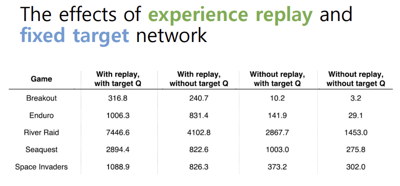 - 진동 방지 : 목표와 예측이 동시에 변할 경우 학습이 불안정해지면서 진동이 발생할 수 있음. fixed target은 이를 방지하기 위해 고안됨