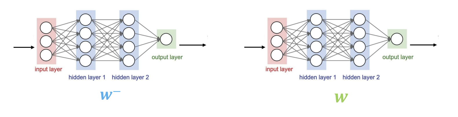 그림에서 왼쪽은 타깃 네트워크 , 오른쪽은 예측 네트워크 w를 나타냄. 예측 네트워크가 지속적으로 학습되는 동안 타깃 네트워크는 일정 기간 동안 고정되어있다가 주기적으로 업데이트됨