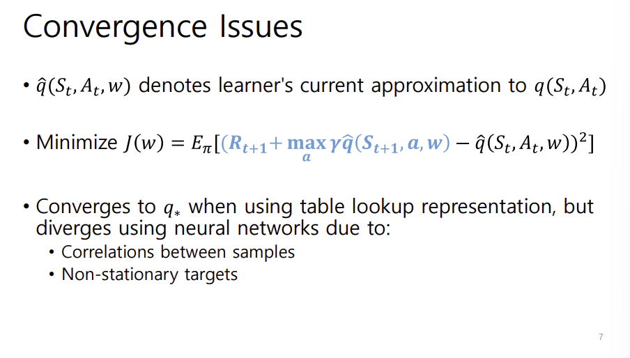 - 아래쪽 식에서는 목표가 R + 감마 곱해진 max로 바뀜. 이는 시간 단계가 지나면서 목표값이 계속 갱신 되는 것을 보여줌.