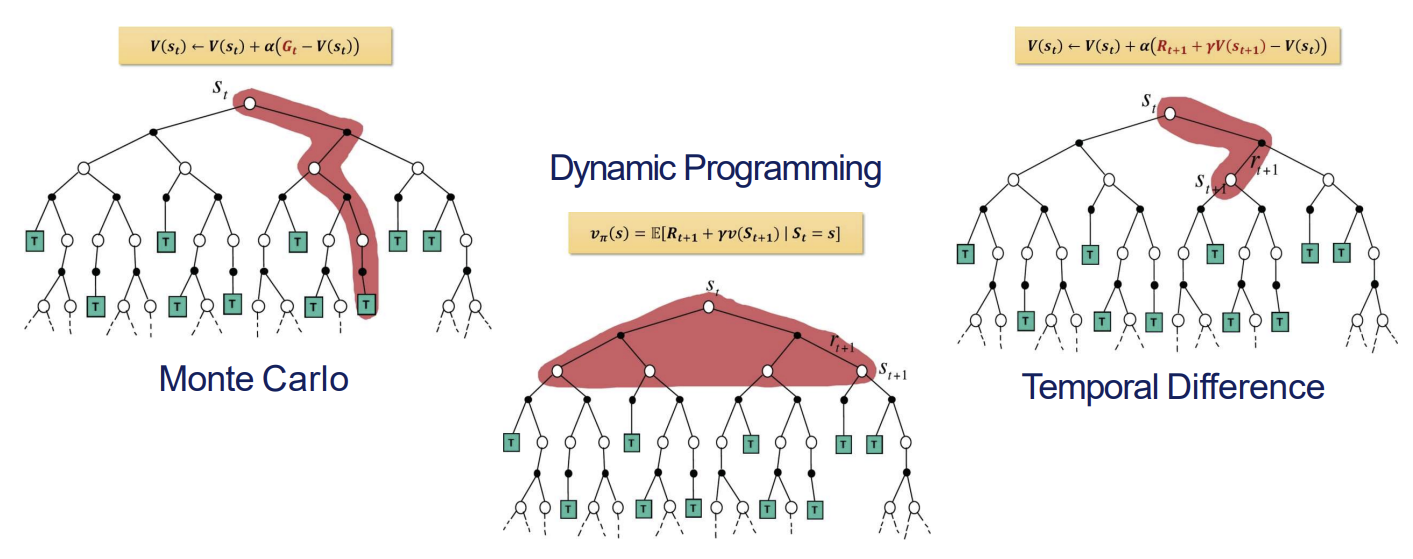 - 현재 상태 S에서 가능한 모든 다음 상태로의 전환을 고려하여 가치를 계산함. 따라서 빨간 영역이 모든 가능한 경로를 포함함