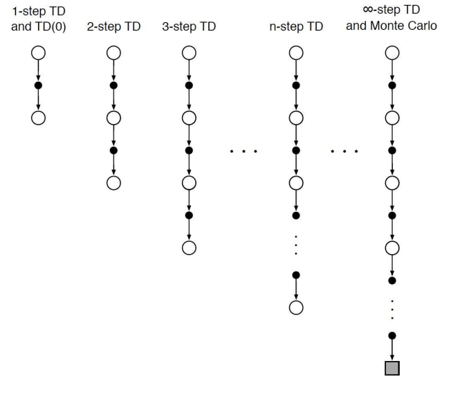 - 지금까지는 1-step TD/TD(0)에 대해 알아보았다. 1-step, 즉 바로 뒤의 미래뿐만 아니라 그 뒤의 뒤에까지, 더 나아가 MC처럼 끝까지 예측하는 TD는 어떨까? :