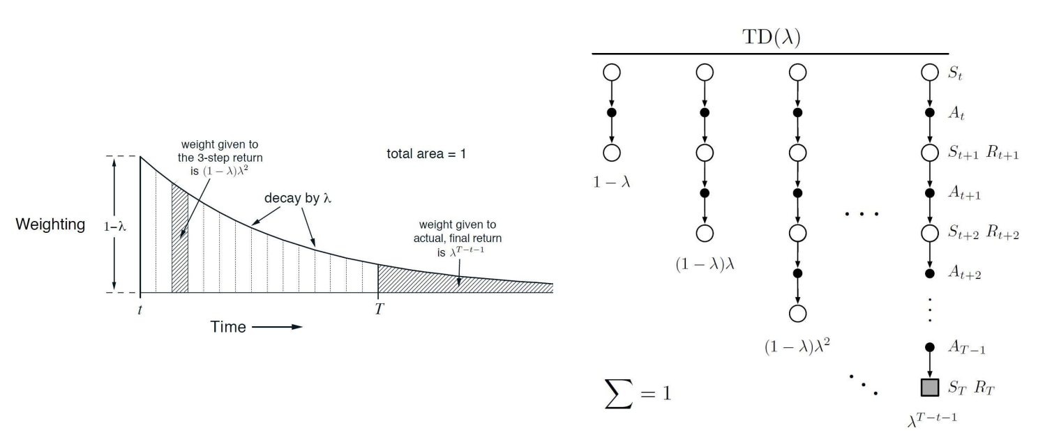 - λ는 0과 1 사이의 값이며 n이 커질수록 λ의 제곱승으로 가중치가 점차 줄어듬. 즉 λ가 클수록 먼 미래의 리턴이 중요하게 반영됨