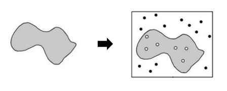 위의 그림은 불규칙한 모양의 면적을 측정하는 예시임. 불규칙한 모양의 면적을 직접 측정하기는 어렵기 때문에, 이 모양이 포함된 범위 안에 무작위로 점을 찍어 샘플링함. 전체 점 중 모양 내부에 위치한 점의 비율을 계산하여 이 비율을 통해 전체 면적에 대한 불규칙한 모양의 면적을 추정함