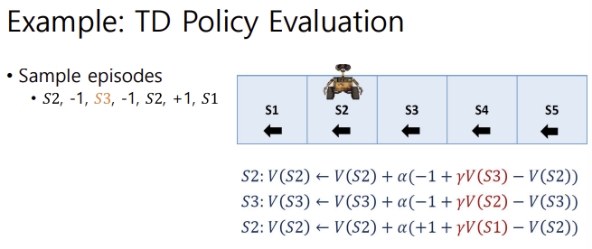 - TD는 끝나지 않은 에피소드로부터 학습함. (by bootstrapping)