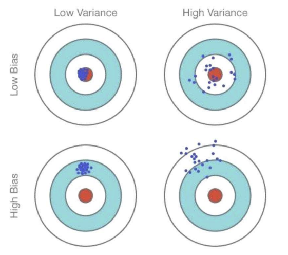 bias가 높으면 걍 target이랑 멀고 낮으면 target이랑 가까움. variance가 낮으면 그림과 같이 데이터가 약간 변하더라도 예측이 크게 달라지지 않으며 안정적으로 중심에 모여있음. 반면 높으면 막 퍼짐