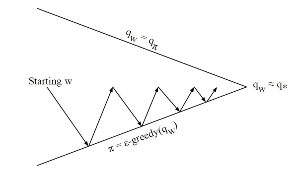 - 시작점에서 정책 평가와 정책 개선을 반복하면서 최적의 정책에 가까워지는 과정을 나타냄. 그림에서 볼 수 있듯, 시작점에서 시작해 반복적인 평가와 개선을 통해 최적의 상태-행동 가치 함수에 수렴하게 됨